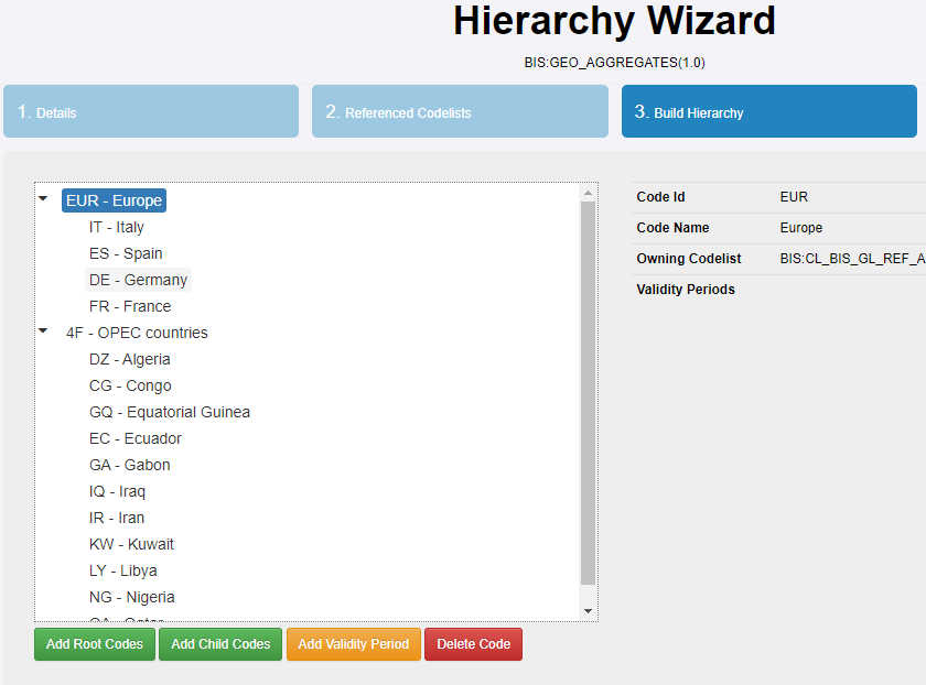 Remember also that Hierarchies are distinct from any simple parent-child relationships that may be defined as part of the Codelist. Indeed there can be any number of different Hierarchies should that need arise and a code can appear multiple times in a Hierarchy. Hierarchies can also reference codes from different Codelists but, for this use case, stick to a single Codelist.