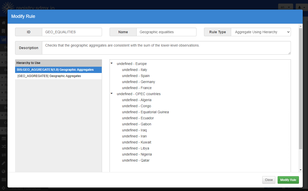However, for checking consistency between aggregation levels where the sum of lower levels should equal the values at higher levels, Hierarchies (Hierarchical Codelists in SDMX 2.1) could be the answer particularly where there are many levels. In these cases, a single Hierarchy replaces many discrete Custom Expressions reducing the creation and maintenance burden.