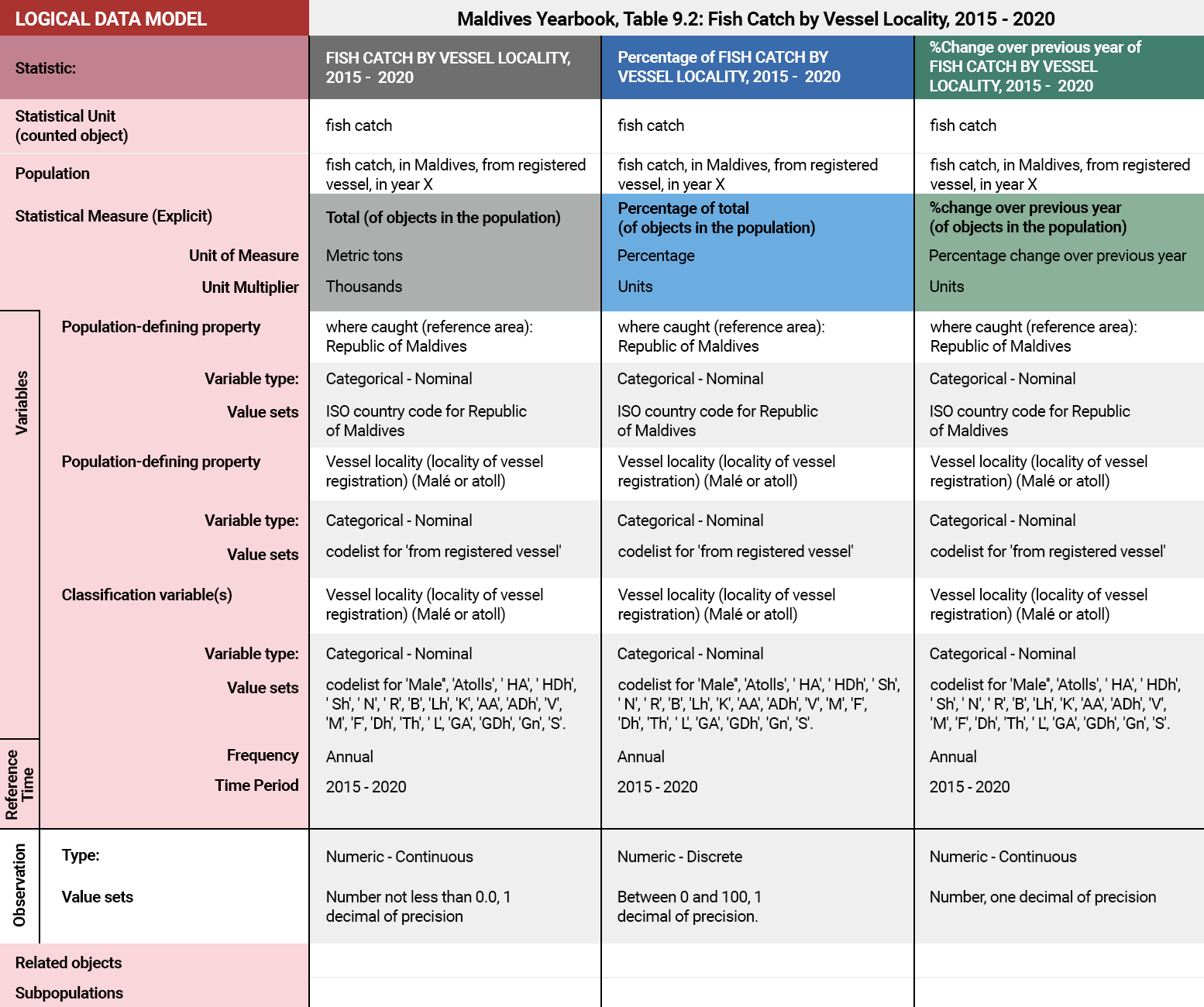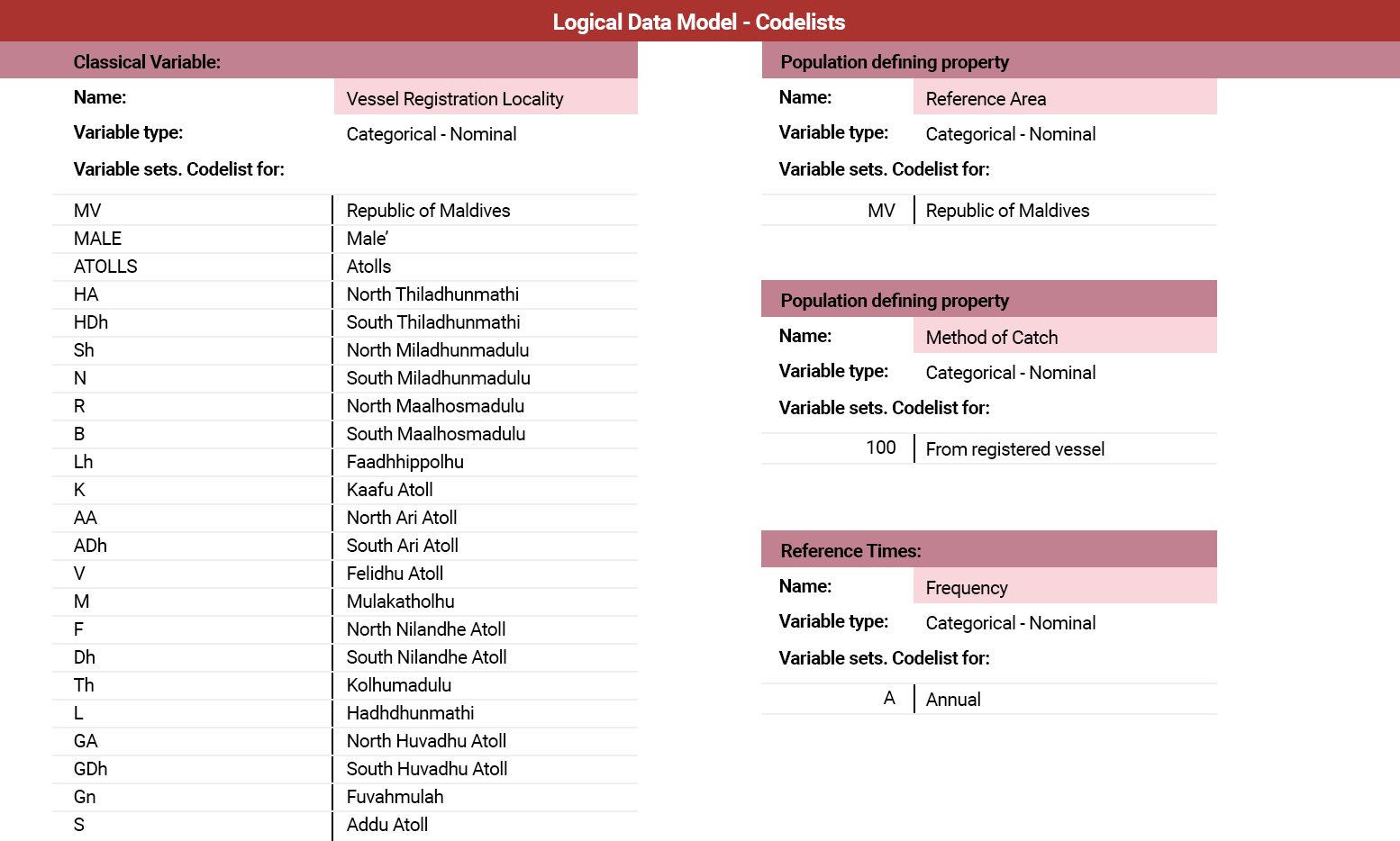 The representation of statistics in the Logical Data Model, however, has its limitations in terms of representing categorical variables with codelists. So, once this initial analytical exercise has been completed, we saw how the categorical variables had the codelists for their valuesets elaborated in a set of codelist tables for ease of reference and ease of use.