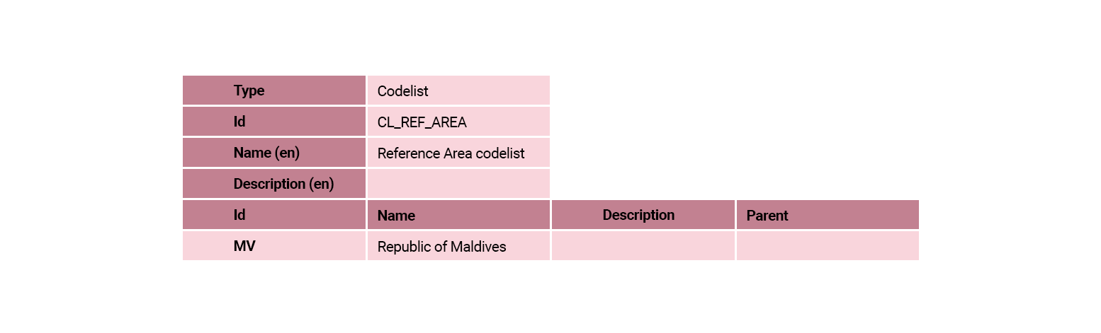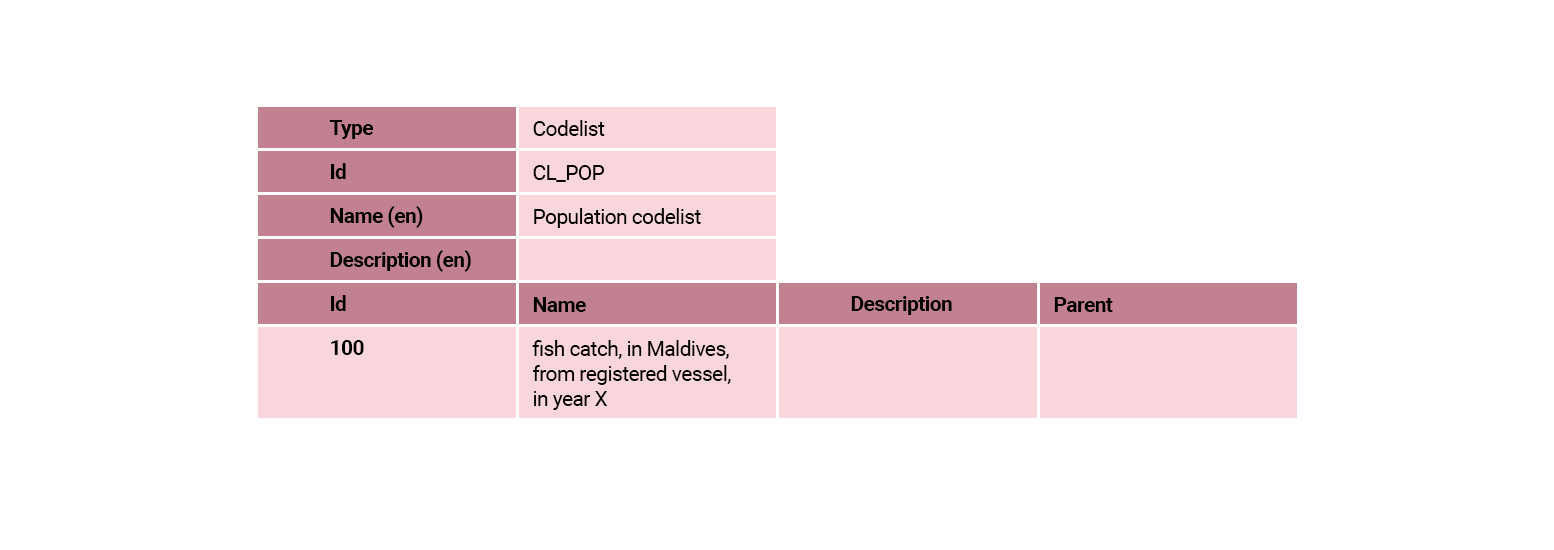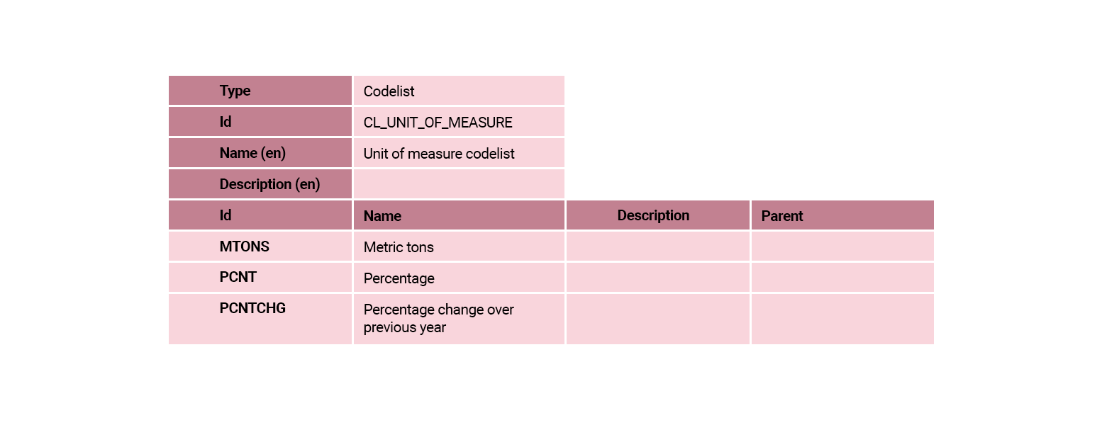 For each row in the concept scheme with “Representation = Codelist”, it is necessary to identify a codelist with the list of possible values. This may require the creation of a new codelist or alternatively, there may be a pre-existing codelist which could be reused. The pre-existing codelist may exist within the statistical system or there may a global codelist which could be used, such as a cross-domain codelist or codelist from a global DSD.