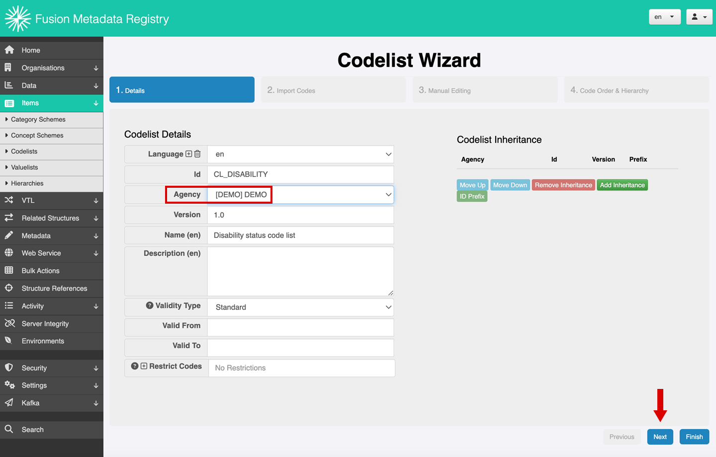 Step 4: In the Codelist Wizard screen, change the content of the Agency field. For this exercise, we’ll change the agency name to DEMO.