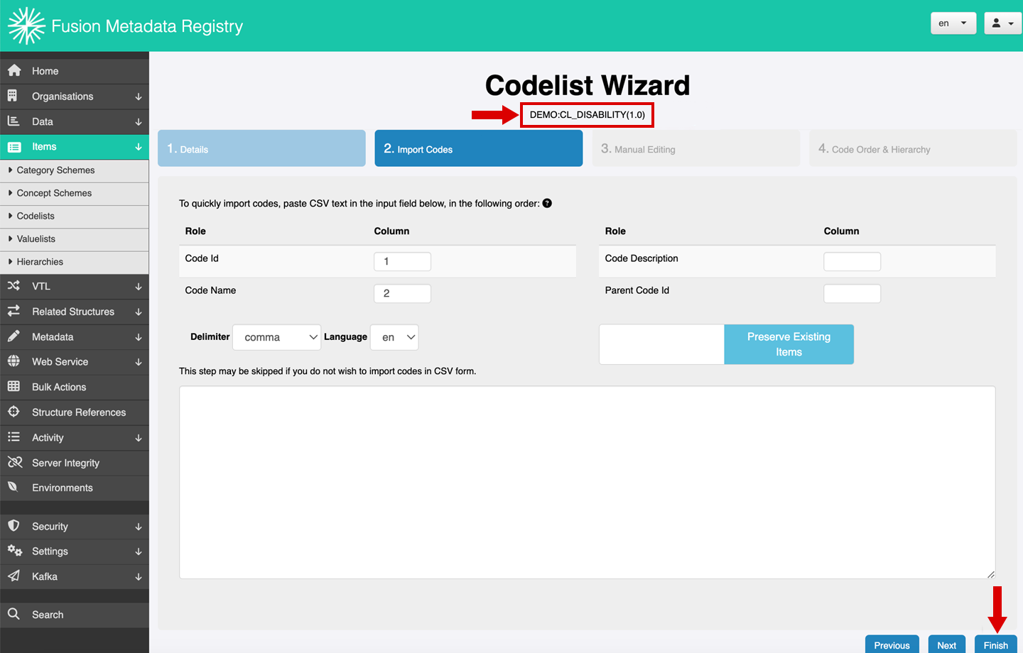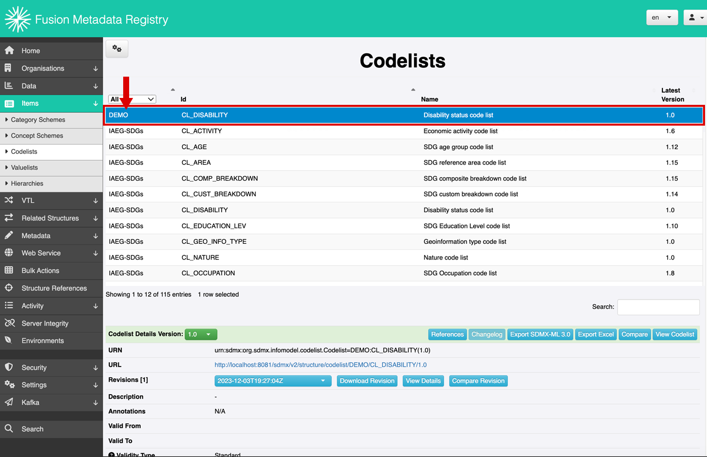 Step 9: Review the list of all codelists to confirm that a new codelist (e.g. CL_DISABILITY) has been created under the DEMO agency.