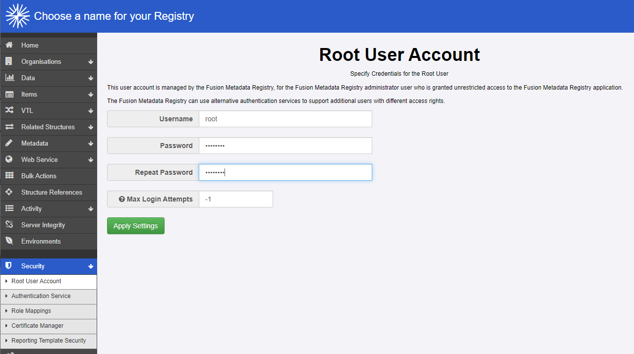 In the standard Docker image, FMR is configured with a single superuser account called ‘root’.