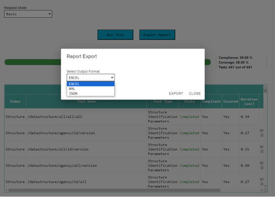 After the test runs, an overview of the test results, including the compliance and coverage rating are presented on the client page. The user can also export the results, by clicking on “Export Report” and selecting the desired export format (Excel, XML or JSON).
